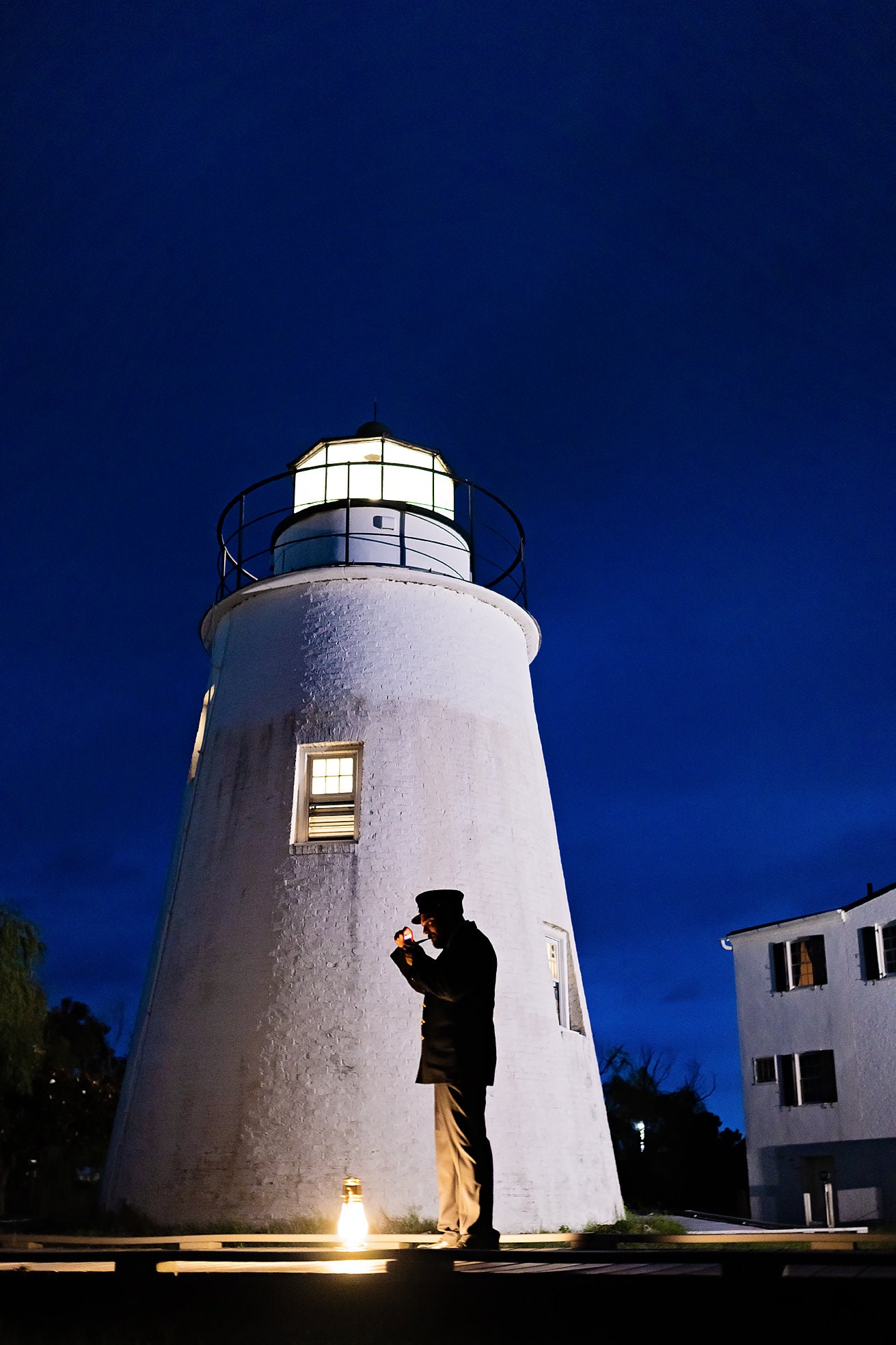 Lighthouse keeper pauses to relight his pipe as he makes his nightly rounds of the Piney Point Lighthouse on Maryland's Chesapeake Bay.