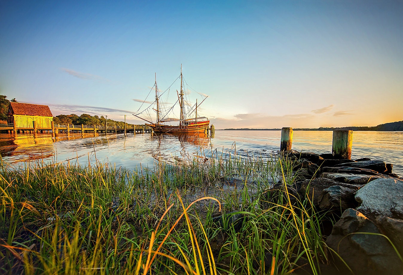 The Maryland Dove ship sits moored at St. Mary's City in southern Maryland. We managed to catch it in some beautiful golden hour light.