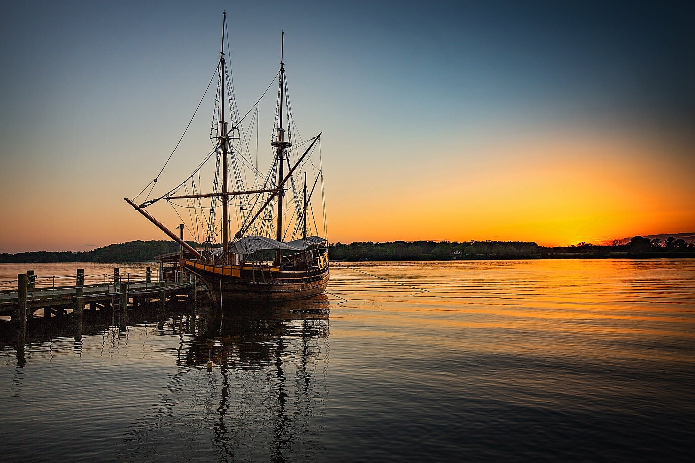 Vibrant sunset light bathes the Maryland Dove ship docked in St. Mary's City, Southern Maryland.