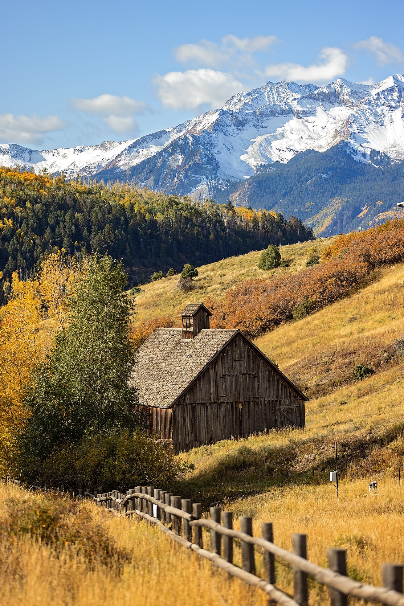 A barn sits tucked in the valley under the San Juan Mountains, Colorado.