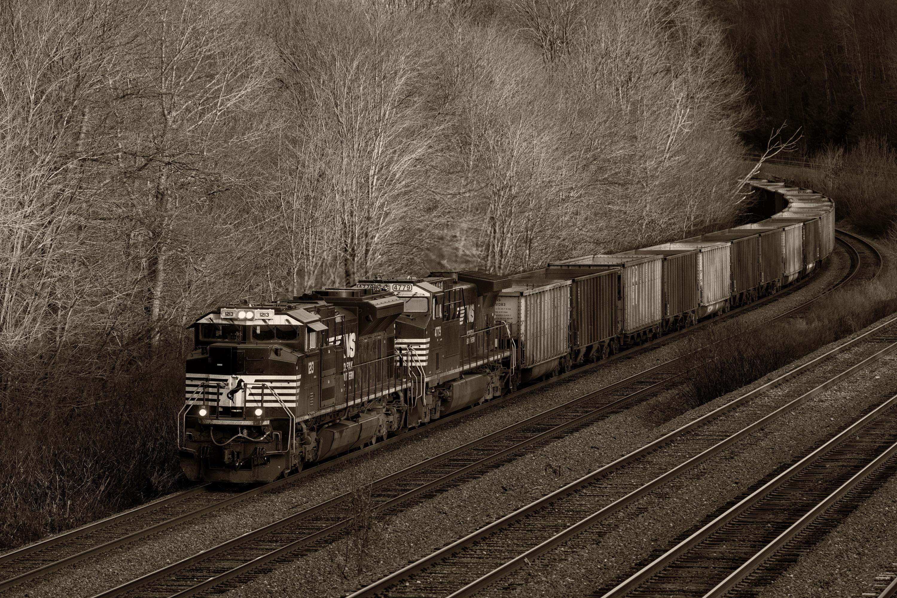 NS 1213 leads a train of coal empties into Cresson, PA as seen from the Route 53 Highbridge.