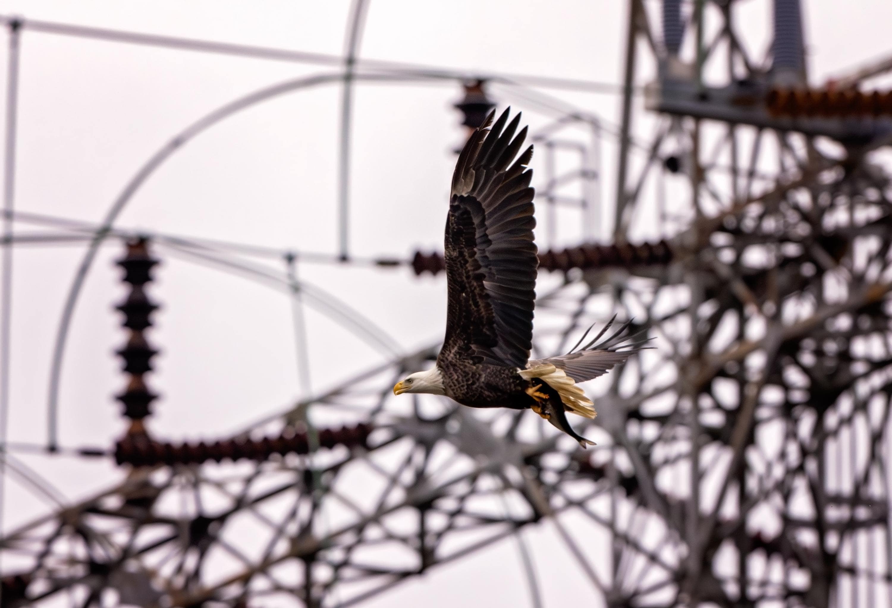A Bald Eagle with fish soars to a tree in front of the transformers atop the Conowingo Dam. I liked how the wing shape mimicked the L shape of the transformers in the background.